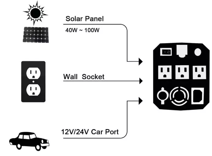 AC/DC 12 v / 220 v / 5 v आउटपुट म्हणून, ते मोबाईल फोन, टॅब्लेट, लॅपटॉप, लहान प्रिंटर, दिवे आणि कंदील, लहान फिश टँक हीटर, फोटोग्राफिक उपकरणे यासारख्या विविध उपकरणांसाठी योग्य आहे.
