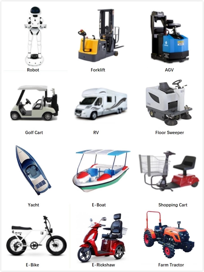 | अनुप्रयोग | गोल्फ कार्ट, इलेक्ट्रिक फोर्कलिफ्ट, स्लो स्पीड कार; एजीव्ही, इलेक्ट्रिक मोटरसायकल; प्रेक्षणीय स्थळे पाहणारी कार; आरव्ही, ट्रायसायकल, इलेक्ट्रिक वाहने, इलेक्ट्रिक व्हीलचेअर्स, इलेक्ट्रिक पॉवर सिस्टीम, अखंड वीज पुरवठा, सौर ऊर्जा साठवण प्रणाली, बोटी |