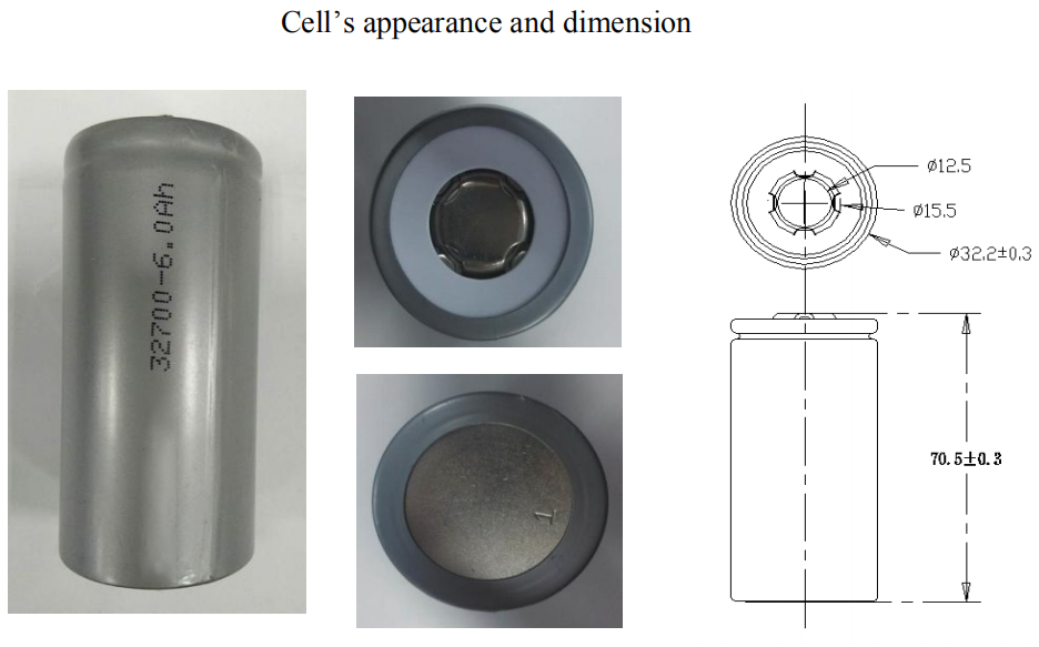सेल SIiz | व्यास: 32.2 ± 0.3 मिमी, कमाल 32.5 मिमी | उंची: 70.5 ± 0.3 मिमी, मॅक्स .70.8 मिमी |