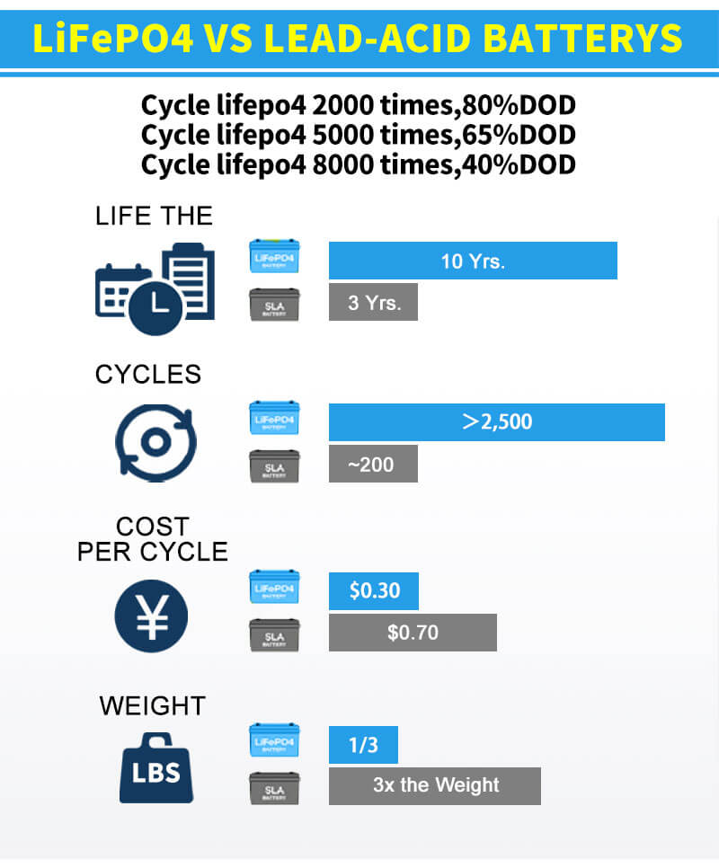 Ighter फिकट वजन: तुलनात्मक लीड acidसिड बॅटरीचे वजन सुमारे 40% आहे. लीड acidसिड बॅटरीची "ड्रॉप इन" रिप्लेसमेंट