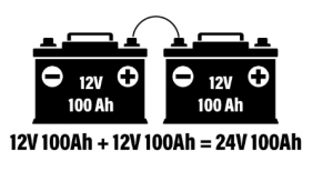 खाली दिलेल्या प्रतिमेत, दोन आहेत 12 व्ही बॅटरी या बॅटरी बँकेस 24 व्ही सिस्टममध्ये रूपांतरित करणार्या मालिकेत जोडले गेले आहे. आपण हे देखील पाहू शकता की बँकेकडे अद्याप 100 एएच क्षमता रेटिंग आहे.