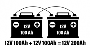 खाली दिलेल्या उदाहरणात, आमच्याकडे दोन 12 व्ही बॅटरी आहेत, परंतु आपण एम्प-तास 200 एएच पर्यंत वाढत आहात.